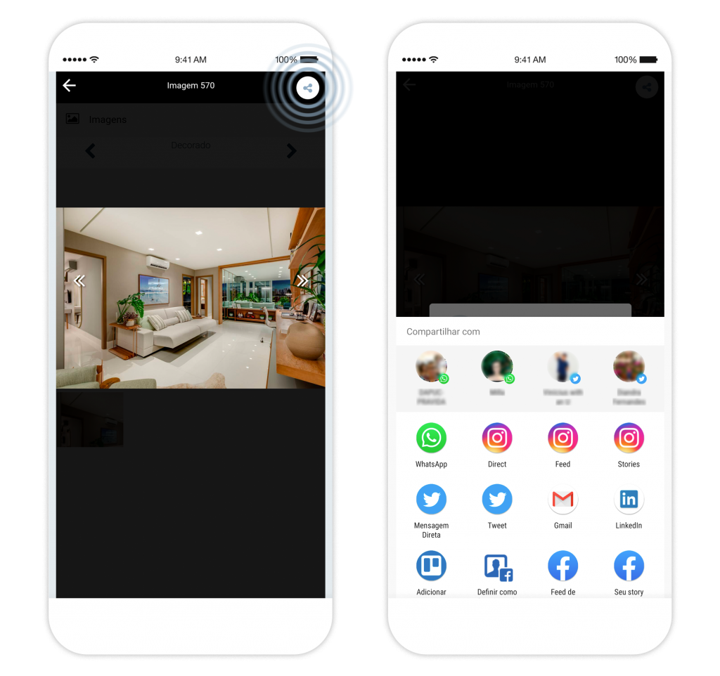 Todos os empreendimentos são cadastrados com um material de vendas completo na incorporadora. As imagens são os principais ativos para chamar a atenção dos clientes. Pelo aplicativo, os corretores podem compartilhar as imagens com prospects e até as usam para divulgar unidades em suas redes sociais.