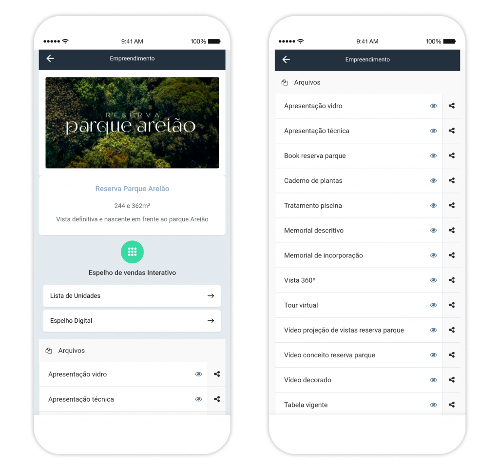 Então, se um corretor está em um evento ou em algum lugar estratégico da cidade, por exemplo, ainda consegue realizar uma venda. Em uma conversa com um prospect interessado, ele consegue verificar a disponibilidade atualizada de unidades e até fazer reservas pelo aplicativo.