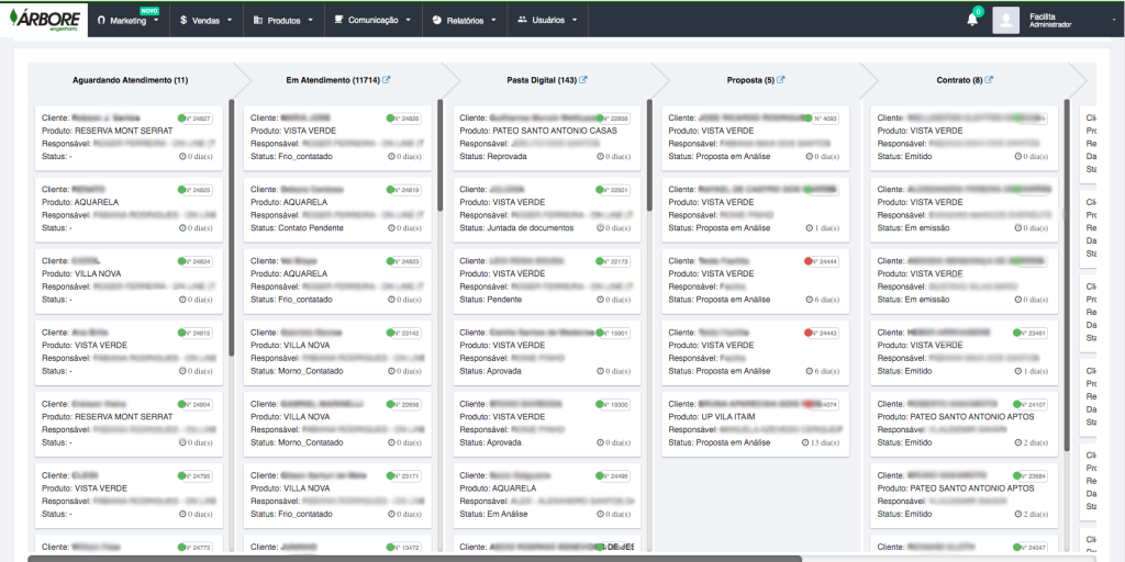 Os gestores da Árbore possuem o controle de todo o processo comercial pelo funil de vendas. Inclusive durante a análise de crédito, etapa na qual o correspondente bancário analisa a viabilidade de compra do cliente.