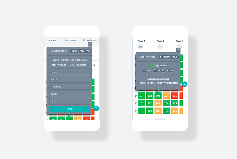Ao abrir o empreendimento do interesse do cliente, o corretor vai ter acesso ao espelho de vendas inteligente, com a disponibilidade das unidades em tempo real. Apresentando cada unidade ao seu cliente, o vendedor pode informar as especificações do lote ou apartamento, e fazer uma solicitação de reserva automaticamente e online.