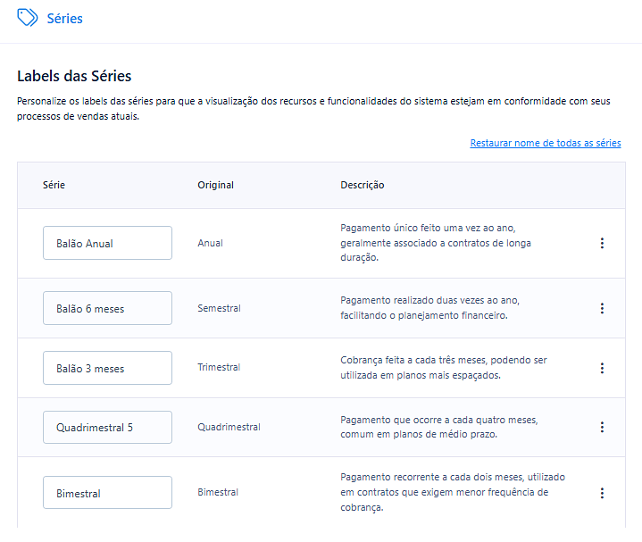 A alteração de nomenclaturas está disponível nas configurações em Propostas na aba Séries.
