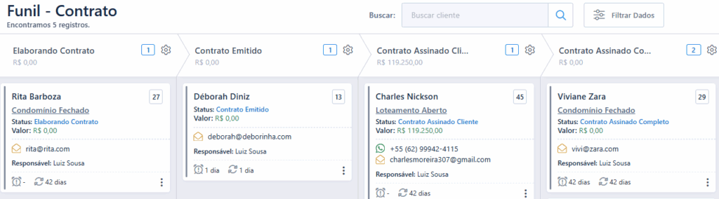 Veja alguns status comuns dentro da etapa de Contrato no Funil de Vendas