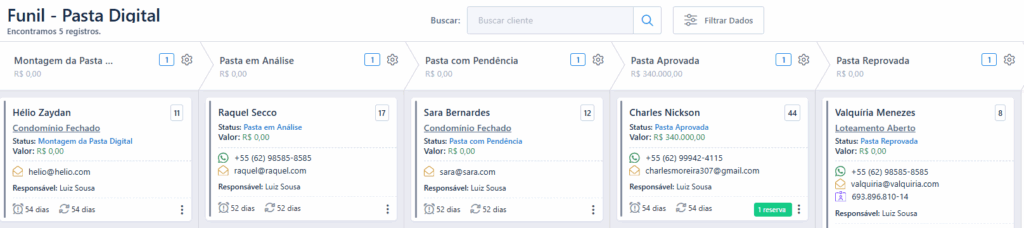 No funil de pastas, o gestor vê de forma rápida todas as pastas em análise, aprovadas e reprovadas. A ferramenta dá uma gestão mais estratégica dos clientes e mostra em cada etapa do funil de pastas eles estão, dando a previsibilidade de vendas de acordo com a quantidade de pastas aprovadas. Isso permite a tomada de decisões assertivas em relação a estratégia de marketing e vendas no lançamento.
