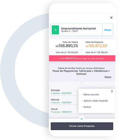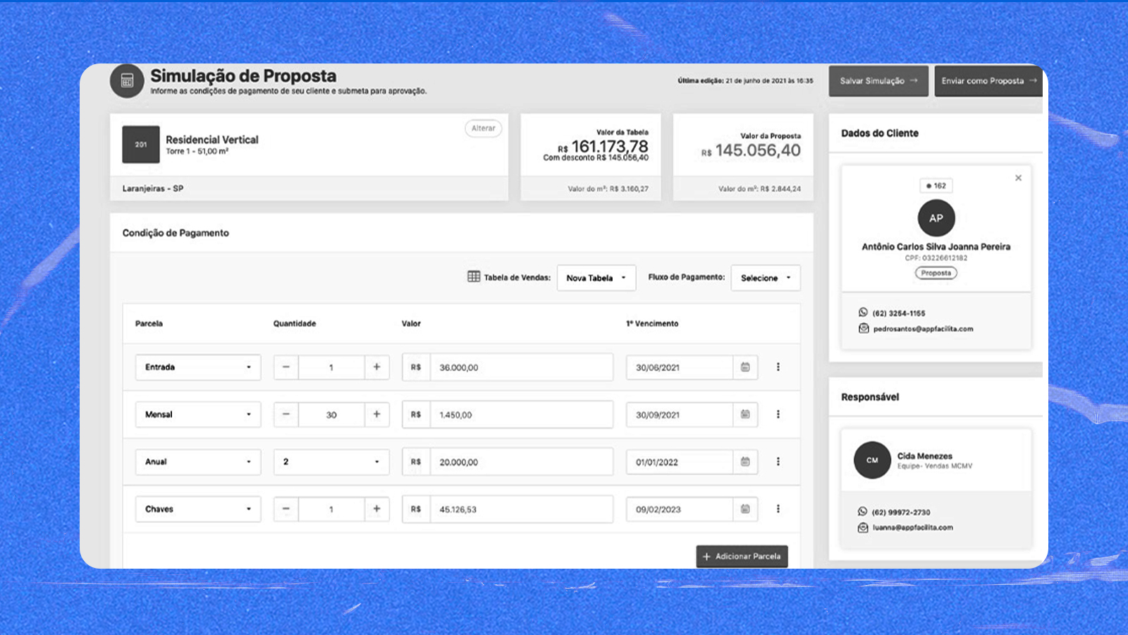 Simulador de propostas dinâmico Confira, em segundos, as variações de valores de entrada, parcelas mensais e saldo nas chaves sob correção IPCA. Essa agilidade torna o atendimento mais assertivo e aumenta a taxa de conversão.